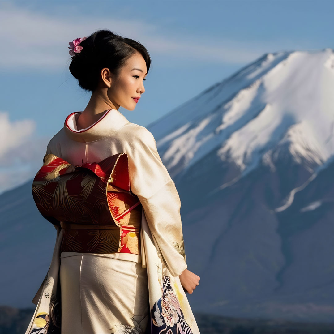 Japanese woman wearing a traditional kimono with Mount Fuji in the background, symbolising Japanese heritage, cultural identity, and the global expansion of Japanese beverage brands.