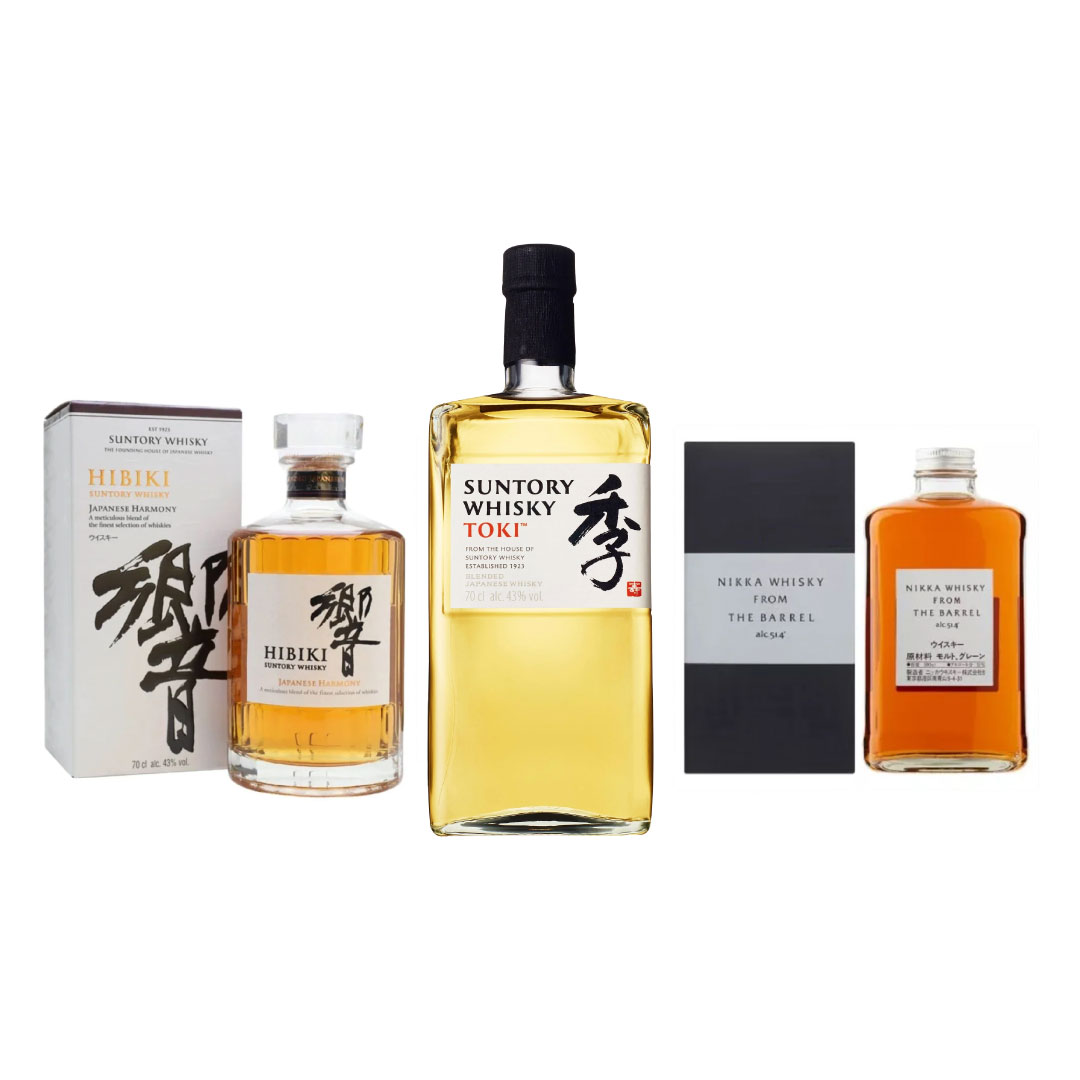 Selection of premium Japanese whiskies including Hibiki Japanese Harmony, Suntory Whisky Toki, and Nikka From the Barrel displayed with their packaging.